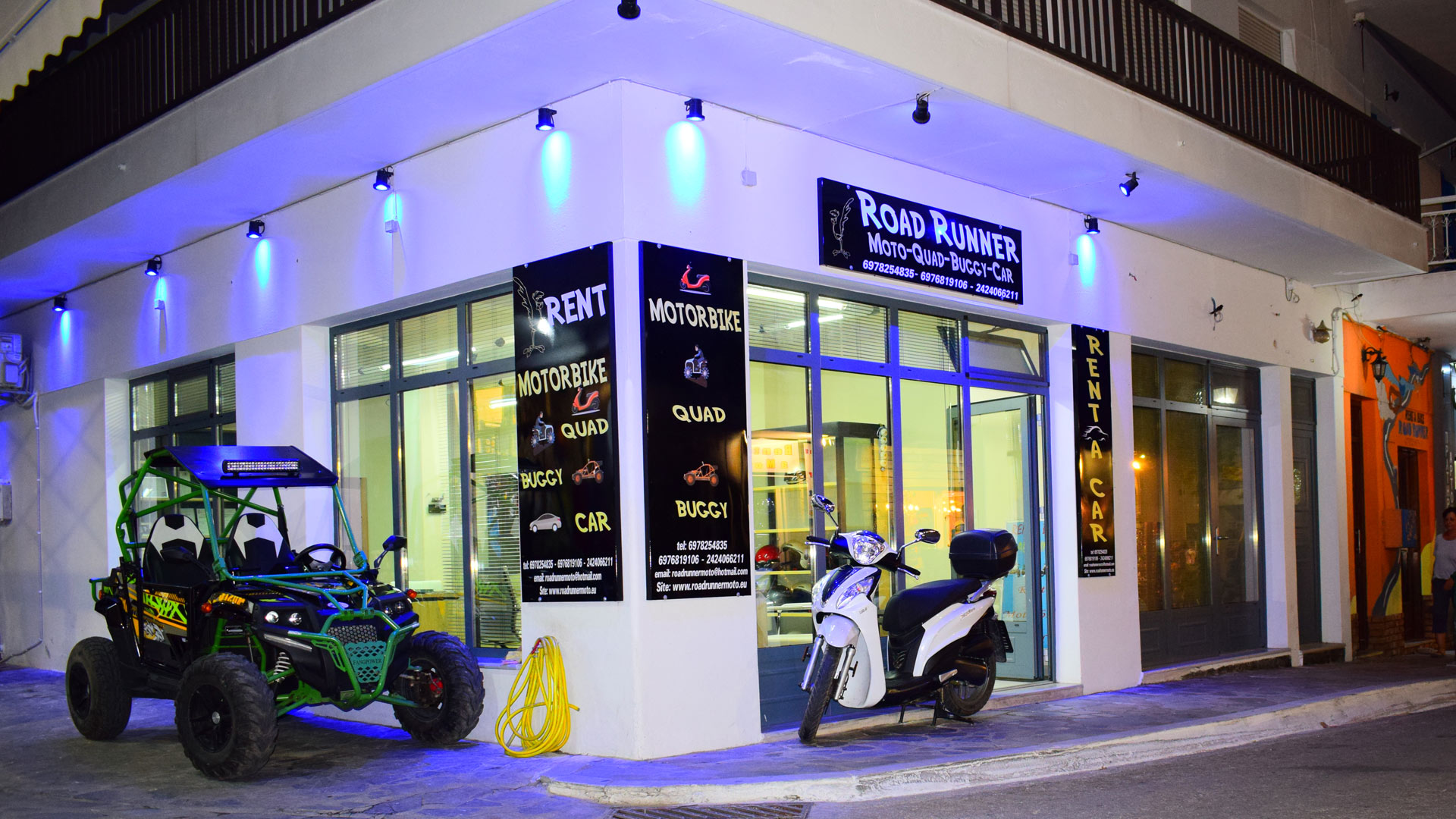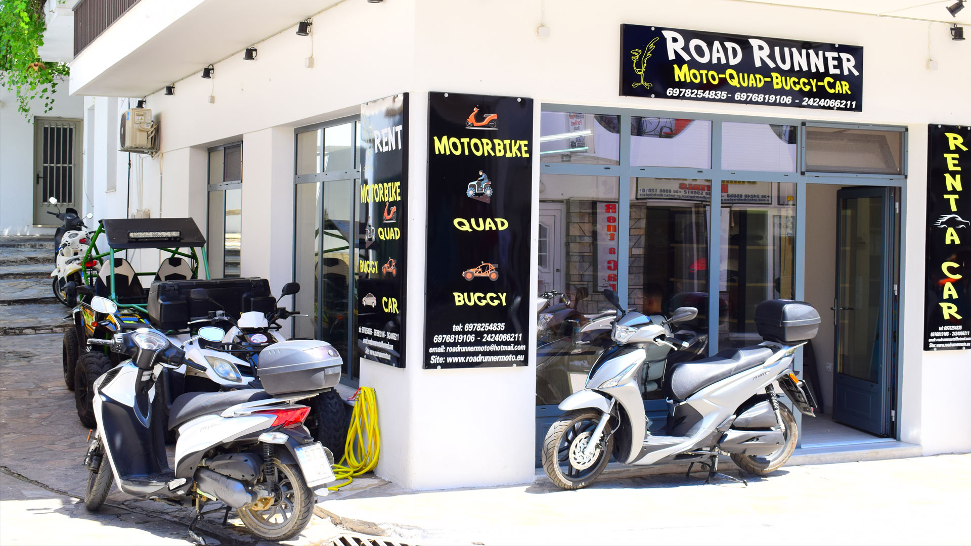 Η εταιρεία Road Runner Rent a Bike καλύπτει κάθε ανάγκη ενοικίασης σε μηχανάκια ή σε γουρούνες στην Αλόννησο. Ο ενδιαφερόμενος μπορεί να επιλέξει από ένα ευρύ φάσμα σε μηχανάκια από 100cc έως 125cc, σε γουρούνες 150cc και 300cc και σε αυτοκίνητα Fiat Panda 1200cc, βενζίνη.